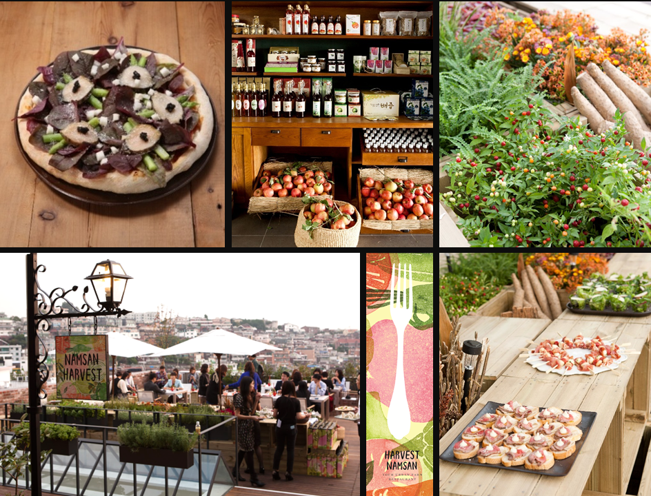Concept planning and brand design for "Harvest Namsan," a flagship rooftop restaurant in Seoul featuring a European-style urban farm concept. Developed a natural food menu, sourced local and organic ingredients, created operational manuals, and executed media promotions and influencer launch events to establish a distinctive farm-to-table brand identity in the heart of the city.